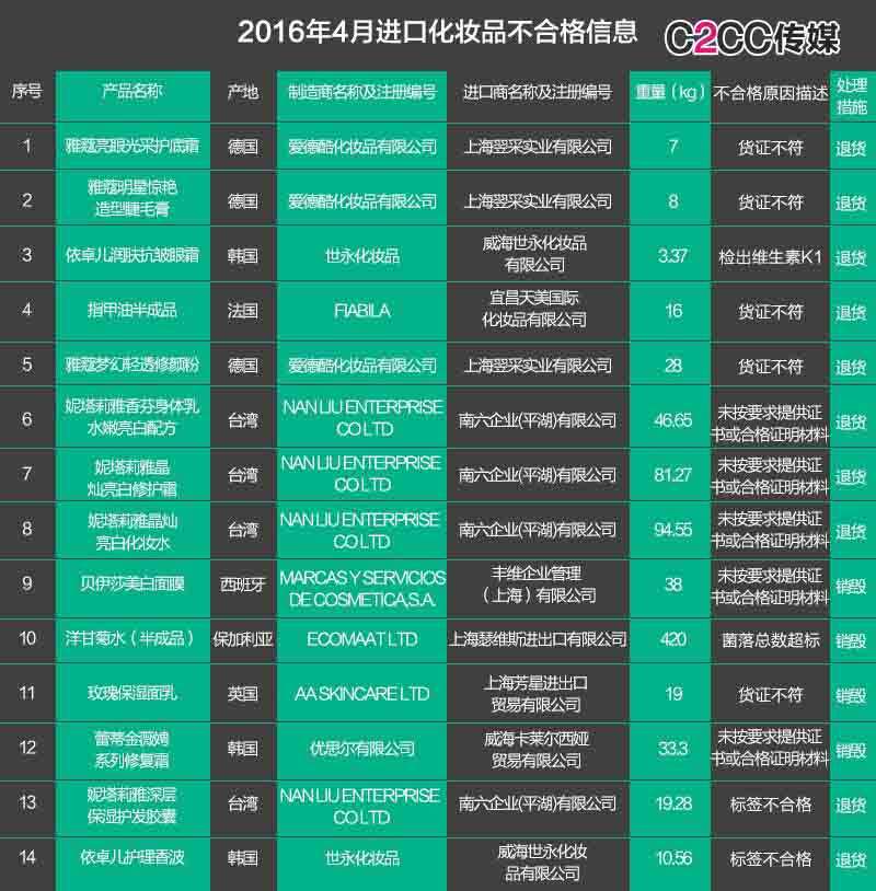6月1日,質(zhì)檢總局發(fā)布了2016年4月進(jìn)口食品化妝品不合格信息,共237批,其中不合格化妝品占14批,涉及雅蔻亮眼光采護(hù)底霜、貝伊莎美白面膜等產(chǎn)品,產(chǎn)地包括德國(guó)、韓國(guó)、法國(guó)等。